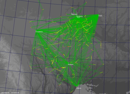 Фото 2 — проекция пути метеора на карту Украины. Этот же метеор попал в камеры, расположенные в Киеве и Прилуках, благодаря чему есть возможность рассчитать его путь в атмосфере Земли и в Солнечной системе.