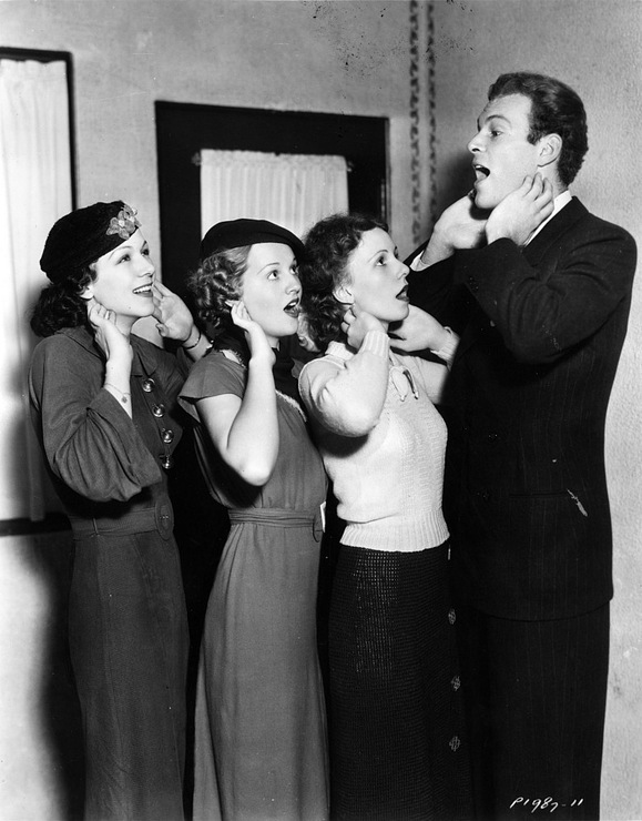 Glenn Erikson teaching pupils how to relax their throats for improved voice control. The Paramount actresses are Kay Gordon, Jane Rhodes and Jeanne Perkins who are all training for “Florida Special”. 1936