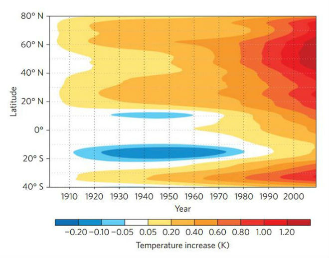 Ученые проанализировали данные об изменении климата с 1990 года, не учитывая показатели в Антарктиде. Потепление начало шествие с Арктики и субтропических регионов обоих полушарий, а сегодня оно наблюдается уже в средних широтах северного полушария.