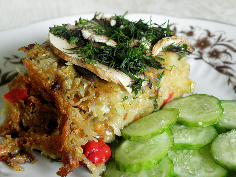 смешиваю с овощами и выкладываю в железную форму (форму обтираю маслом и присыпаю сухарями, но без фанатизма).