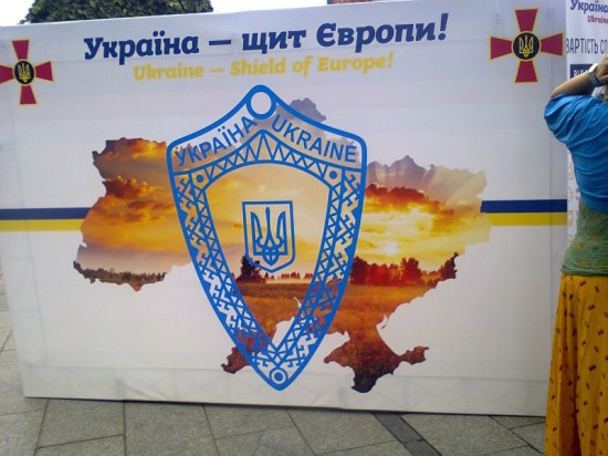 А это акция в поддержку армии — здесь проводились всевозможные благотворительные мероприятия и продавались сувенирные товары — за мелкий сувенир большая стоимость, а деньги на АТО. Например — символический щит, в который можно вбить свой «гвоздик» за 100 грн.