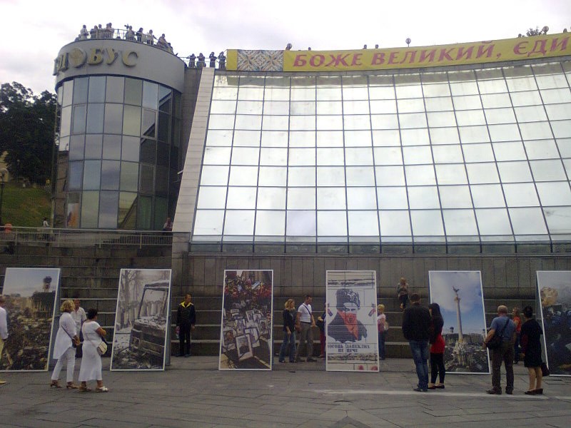 А возле «Глобуса» проходит выставка фотографий — напоминающих о событиях в Киеве зимой этого года…