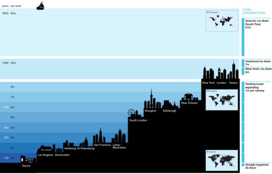 Всем известная постоянно тонущая Венеция на самом деле может утонуть, если уровень воды поднимется еще на метр. Так же, в опасности находится Санкт-Петербург, где в последние годы отмечают участившиеся наводнения. Несмотря на защитные сооружения и охраняющая от приливов система Барьер Темзы, Лондон тоже не застрахован от затопления. Гамбург находится в ста километрах от моря, но положение в устье Эльбы делает вероятным его уход под воду при подъеме уровня океана на 2 с половиной метра. В Китае система защиты от наводнений развита довольно слабо, поэтому подъем воды даже на полтора метра может угрожать многим миллионам жителей Шанхая, Гонконга, Гуанчжоу, Шеньчженя. В Северной Америке дела не лучше. Новый Орлеан и так достаточно часто страдает от штормов и наводнений. Ураган Катрина уничтожил практически половину города, и это может повториться. В неменьшей опасности находится Нью-Йорк. Во время штормов прибрежная часть города попадает в зону наводнений, а чтобы ее полностью затопило, вода должна подняться на 3 метра. При таком подъеме уровня моря затопление грозит так же Сан-Франциско и Лос-Анджелесу.